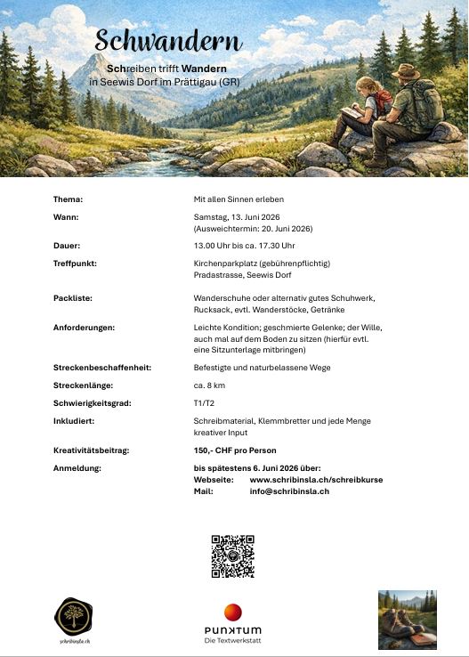 Gemeinsam schwandern wir in einer kleinen Gruppe von 10 Personen von Bänkli zu Bänkli. Unterwegs laden wir Dich durch gezielte Schreibimpulse dazu ein, Deine Umgebung und die Natur mit allen Sinnen wahrzunehmen.